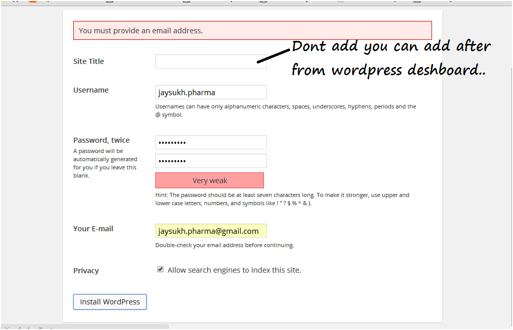 Now you have to enter wordpress website title (Not mandatory). User name, password and email address are required fields.